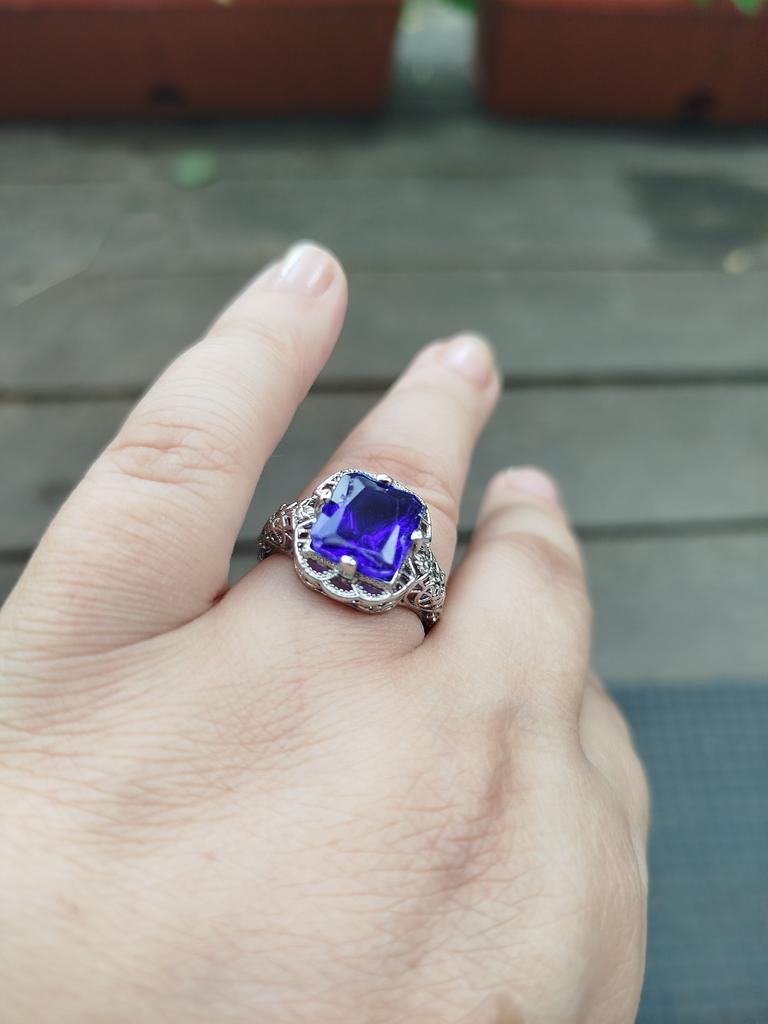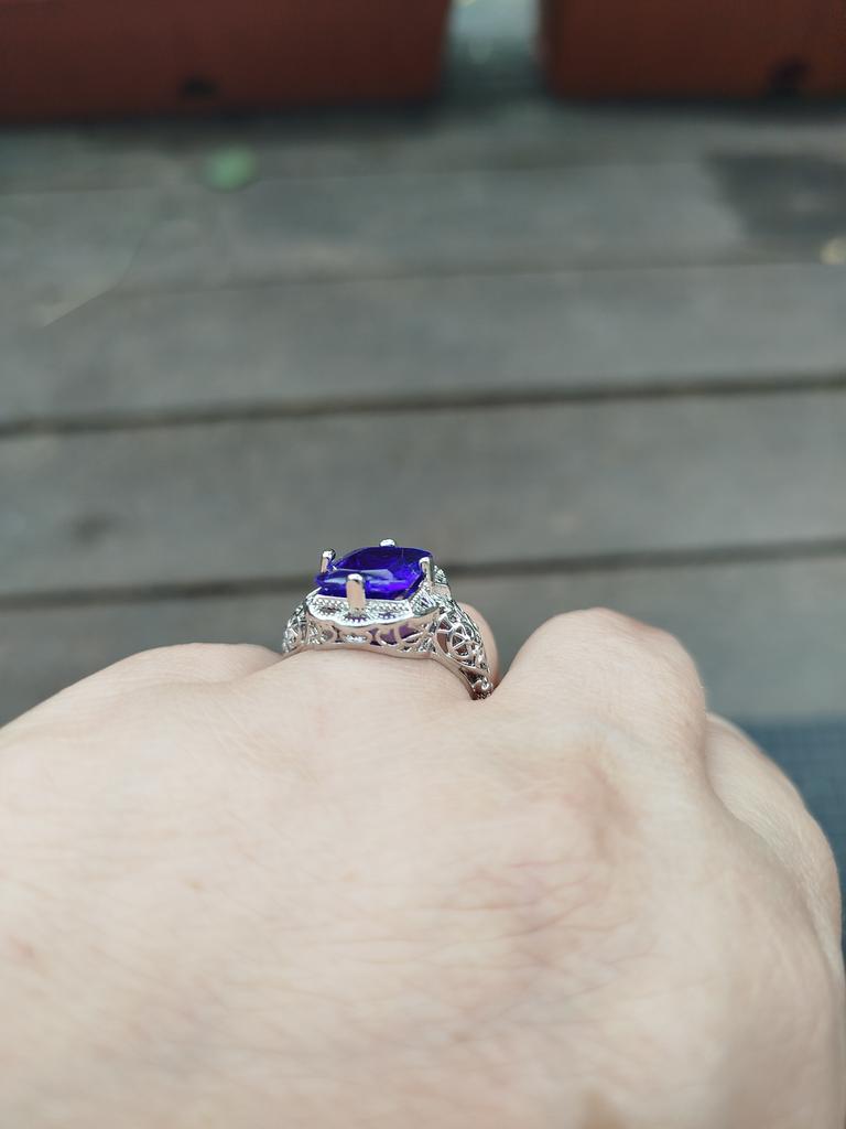 Very beautiful ring, just like in the photo. The ring size corresponds to the one ordered. Size of the upper part of the ring - 1,6×1,6 cm, stone size - 1,2×0,9 cm in an openwork metal setting. Looks wonderful on the finger. Interesting design. The stone changes color from purple to blue depending on the lighting. Very happy with the purchase.