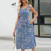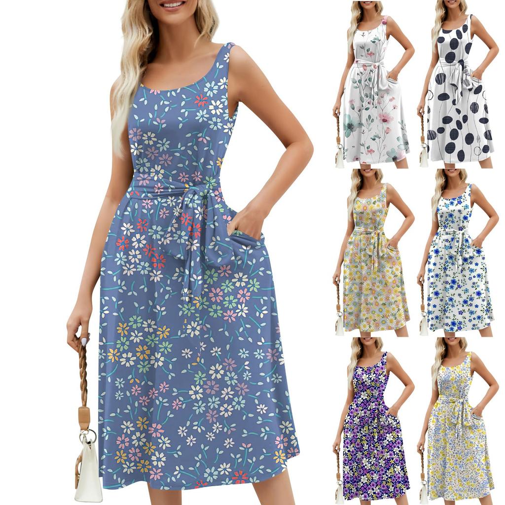Women's Summer Beach Loose Round Neck Sleeveless Midi A-Line Dress Floral Print Lace-up Pocket Vest Dress — buy online with free worldwide shipping!