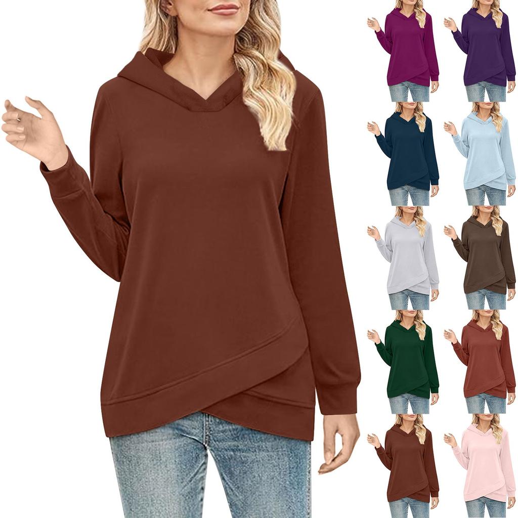 Women's Fashion Solid Color Hoodie Long Sleeved Cross Hem Sweatshirt Top