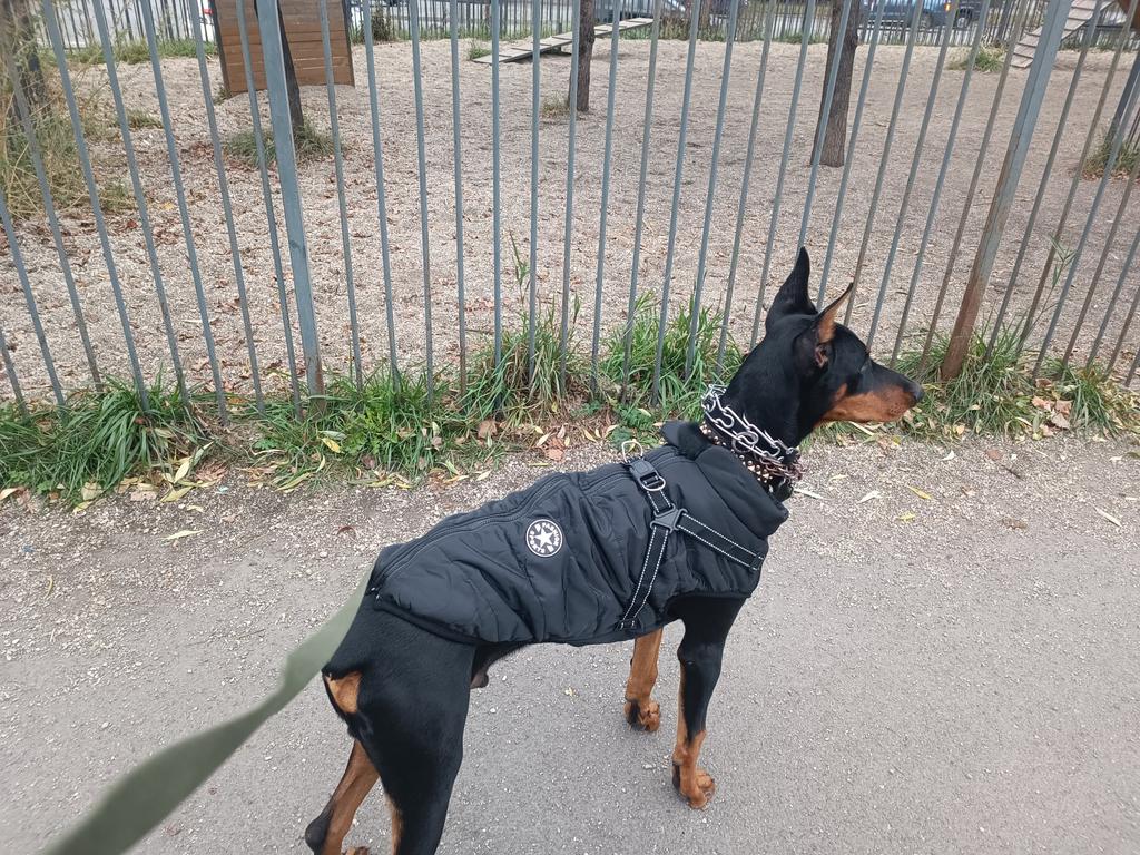 Awesome jacket that fits well! a little short in the back but overall the size fit perfectly. Doberman 7 months.