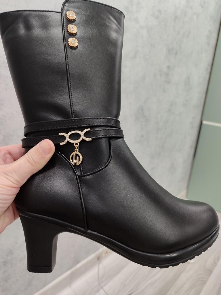 Winter Woman High-heeled Soft Leather Motorcycle Boots Thick Wool Soft Sole Plus Velvet Warm Riding Mid-calf Boot
