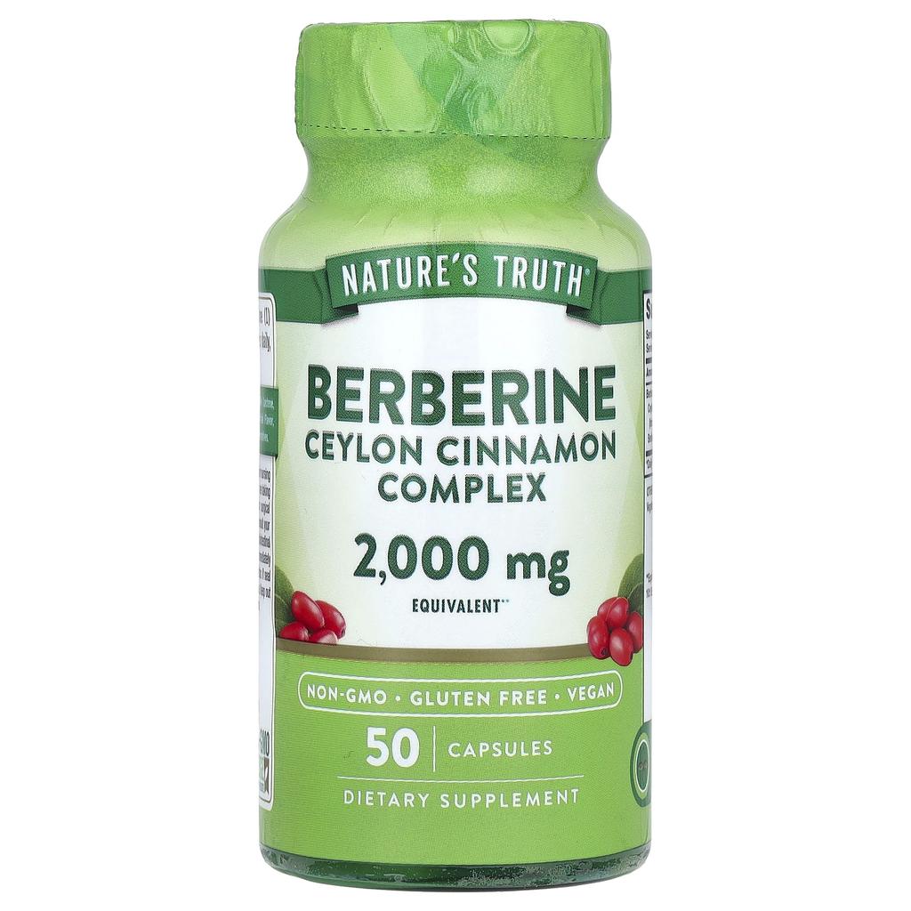 Product Description: 2,000 mg equivalent**Non-GMOGluten-FreeVegan Supplement100% Quality AssuranceEnhanced ComplexNon-GMO PledgeWhat is berberine?Berberine is made of goldenseal, gold thread, Oregon grape, philodendron, tree turmeric, and bar. It is a plant extract found in the roots, rhizomes, stems, and bark of several plants, including berries. Our formula is specially derived from extracts of barberry, the large evergreen shrub that produces barberries.Nature's Truth Berberine CapsulesBarberries contain berberine, but because they are typically very sour, many people choose to take supplements instead of berberine. Our enhanced formula combines berberine and Ceylon cinnamon, also known as true cinnamon, to provide the equivalent of 2,000 mg of Berberine Ceylon Cinnamon Complex in one convenient vegan capsule.** You can take one capsule up to two times daily. Nature's Truth: Where Wellness BeginsNature's Truth's mission is to provide customers with their wellness needs through a variety of products. Nature's Truth offers supplements in a variety of forms, including capsules, softgels, chewables, tablets, powders, liquids, and gummies, to suit every preference. **As used in proprietary blend made with 10 parts Ceylon cinnamon extract and berberine HCl.