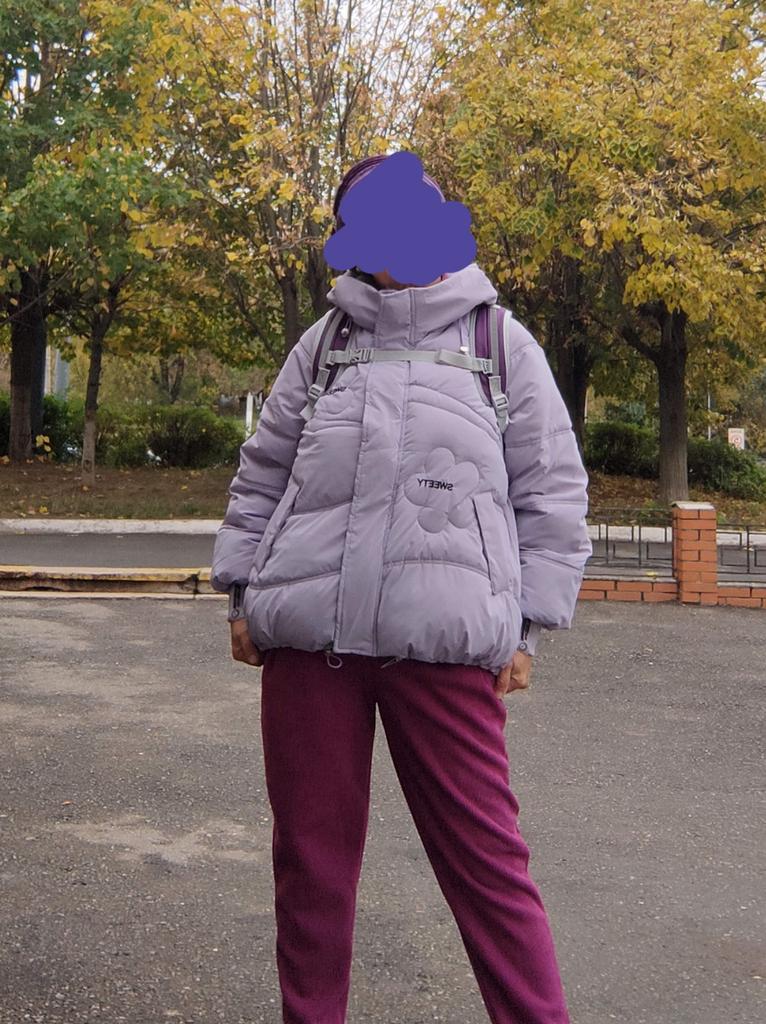 Wonderful jacket. High-quality, warm, as in the photo. And the color is more gray than purple. Only shorter than stated. It's too short for me, at a height of 165 it doesn't cover the back.