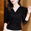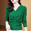 Women Clothes Ruched Rhinestone V Neck Long Sleeve All Match Casual T-shirt Autumn Elegant Fashion Ladies Solid Slim Basic Tops