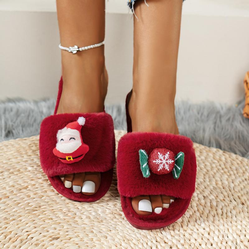 European and American Christmas Element Slippers for Women's 2024 Autumn Winter New Cartoon Cute Flat Bottom Women's Slippers