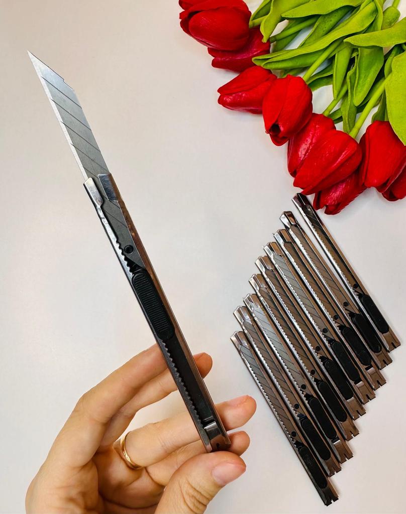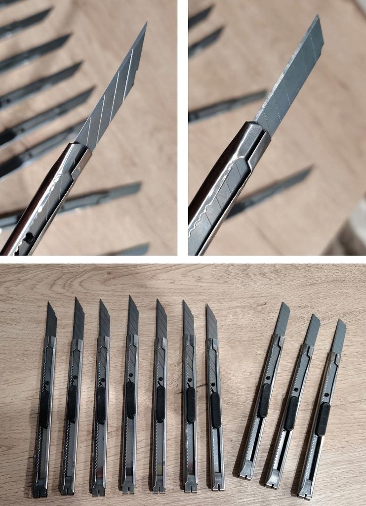 Set of 10 stationery knives Knives are retractable, blades are different. With a sharp edge or with a blade at a slight angle. Knives are light, metal Fit comfortably in the hand Extends approximately 10 cm Spicy 👌