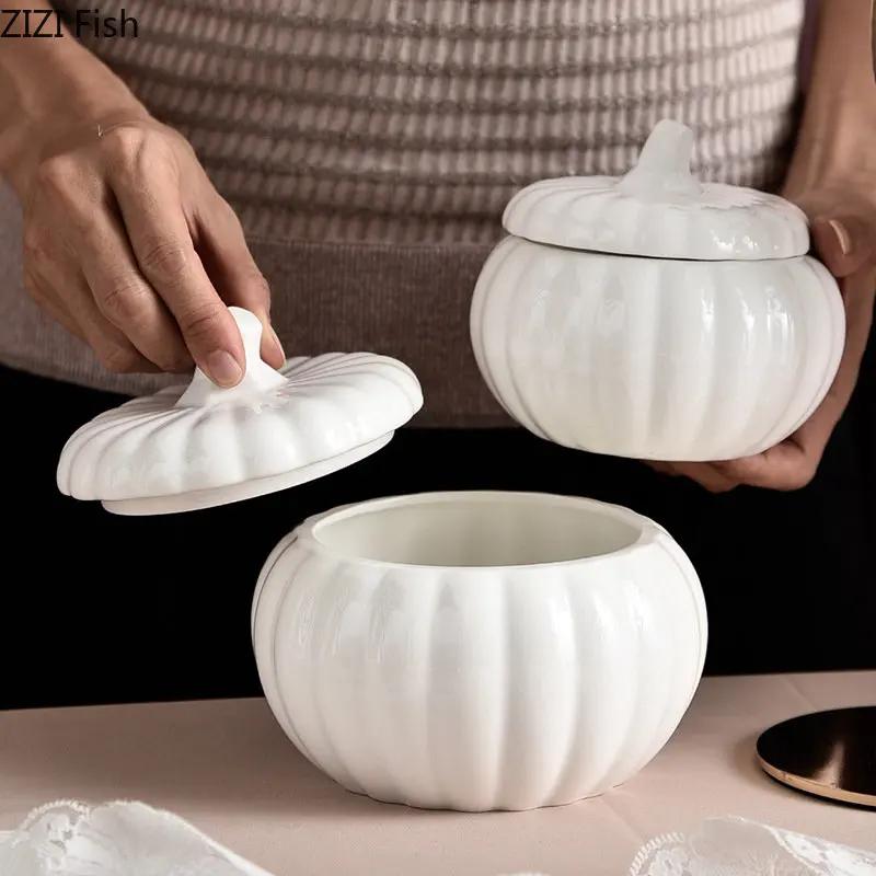 Creative Pumpkin Ceramic Bowl with Cover Hotel Restaurant Ice Cream Dessert Bowl Soup Bowl Nordic Home Kitchen White Tableware — buy online with free worldwide shipping!