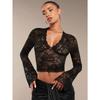 Spring Elegant Women's Solid Colour Sexy Transparent Lace V-Neck Tight Flare Long Sleeve T-Shirt