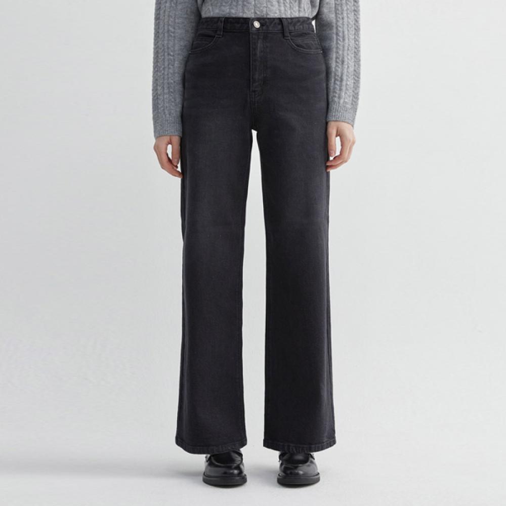 This wide denim pants feature a relaxed silhouette with a chic design. The charcoal-hued deep color is versatile and pairs well with various tops, suitable for both casual and office settings. The gently sloping line from the waist to the hem offers a flattering look while ensuring a comfortable fit.