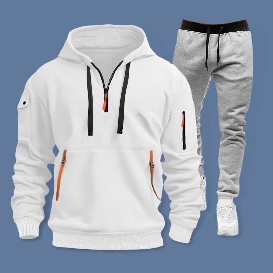 Men's sports suit is crafted from skin-friendly and breathable polyester fiber, ideal for fitness enthusiasts. The regular fit design ensures both style and comfort, comprising a long-sleeved hooded sweatshirt and elastic-waisted trousers that cater to various body types.