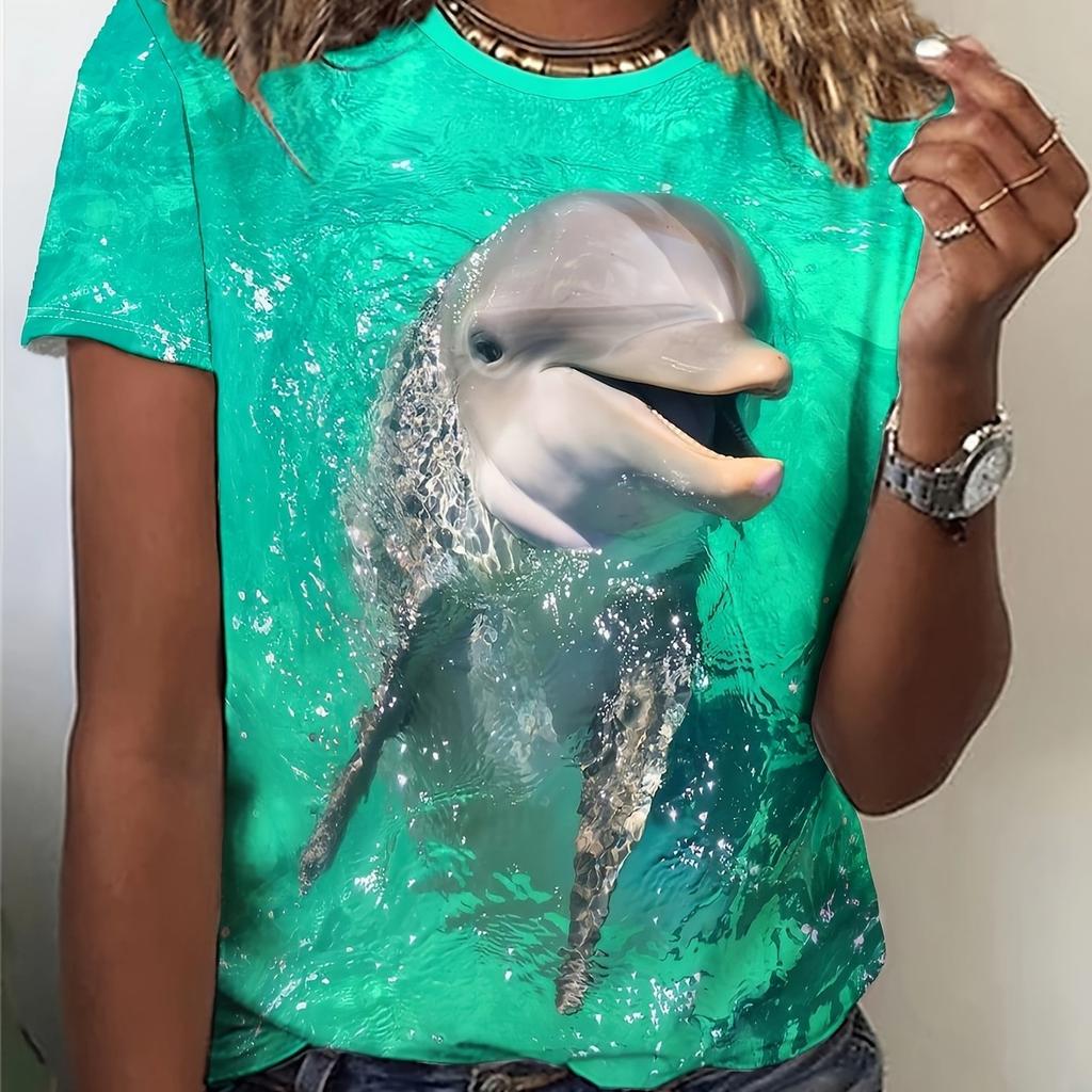 Vibrant Dolphin Print Crew Neck T-Shirt - Women's Casual Short Sleeve Tee for Spring & Summer - Soft, Breathable, Relaxed Fit Clothing for Ladies — buy online with free worldwide shipping!
