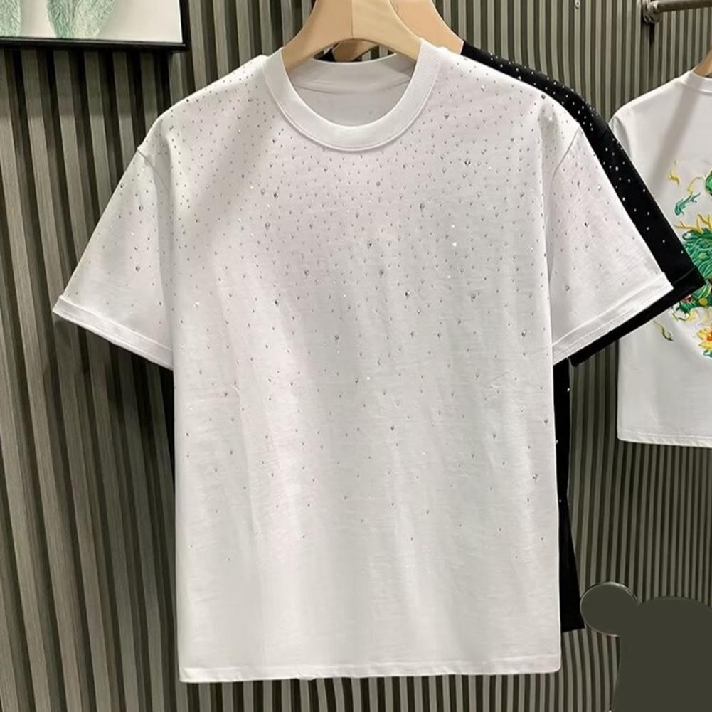 Design: This men's short-sleeved T-shirt features a stylish touch with hot rhinestone embellishments, offering a unique and eye-catching look that stands out effortlessly.
