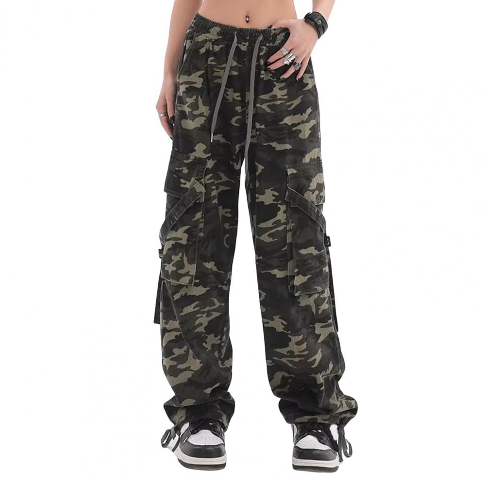Women Cargo Pants Camouflage Print Multi Pockets Lace-Up Detail Long Pants Straight Wide Leg High Street Pants