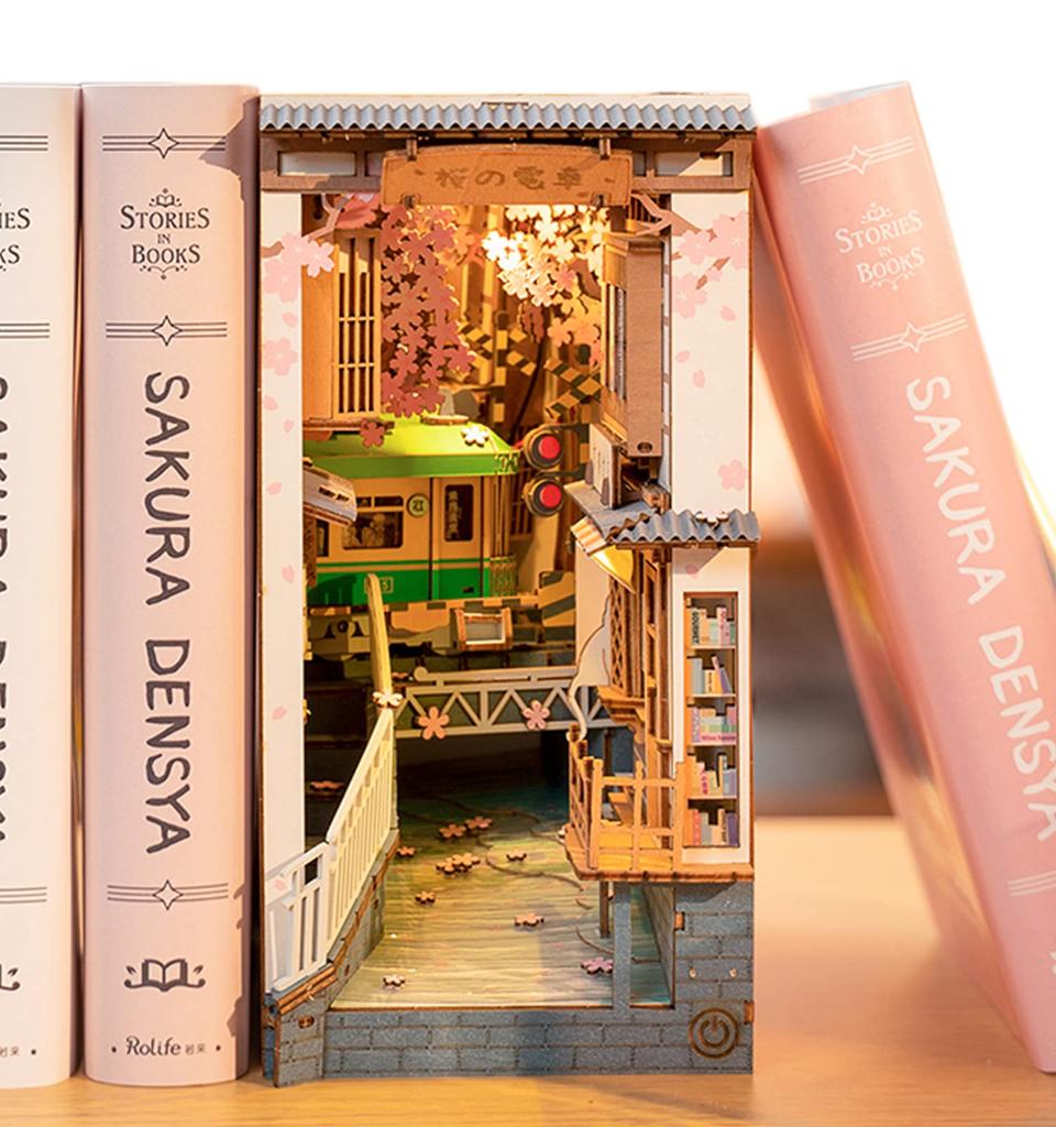 Rolife DIY Book Nook Cherry Blossom Train 3D Puzzle Miniature House Kit Bookend Bookstand LED Bookshelf Decoration Handmade Kit Assembly Wooden Puzzle