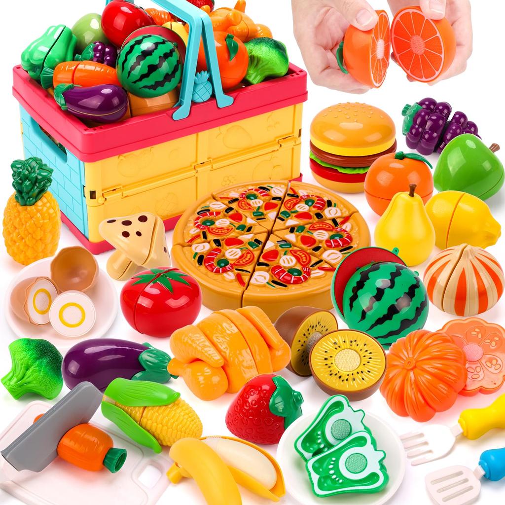 [Luxury set] Corn 🌽, grapes 🍇, banana 🍌, pumpkin, kiwi 🥝, strawberry 🍓, orange 🍊, mushroom 🍄, onion, egg 🥚, carrot 🥕, tomato 🍅, 🍆eggplant, green pepper, broccoli 🥦, pineapple 🍍, watermelon A complete 35-piece set including 🍉, apple 🍎, lemon 🍋, pear, hamburger 🍔, pizza 🍕, chicken 🦃, knife, plate, knife and fork, and cute basket. You can make new kinds of fruits by gluing different fruits together, or you can imitate mom and cut different kinds of fruits.