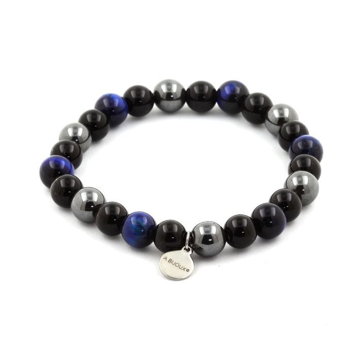 Stones and Minerals. Blue Tiger Eye Beads Bracelet + Hematite + Black Agate 8 Mm. Made In France.