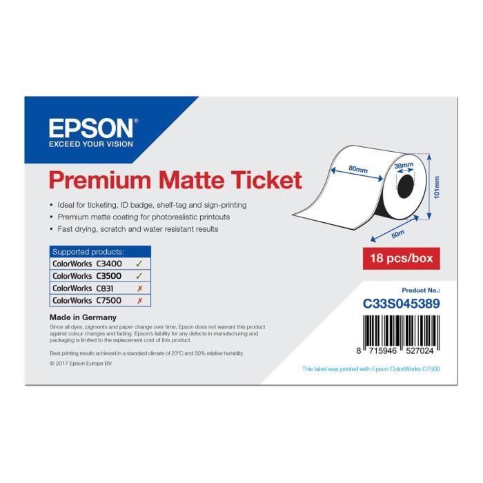 Epson Premium Mat Rouleau (8 Cm X 50 M) 1 Rouleau(x) Tickets Pour Epson GP-C831, TM-C3400-LT; ColorWorks TM-C7500, TM-C7500G; TM… — buy products online with free worldwide shipping!
