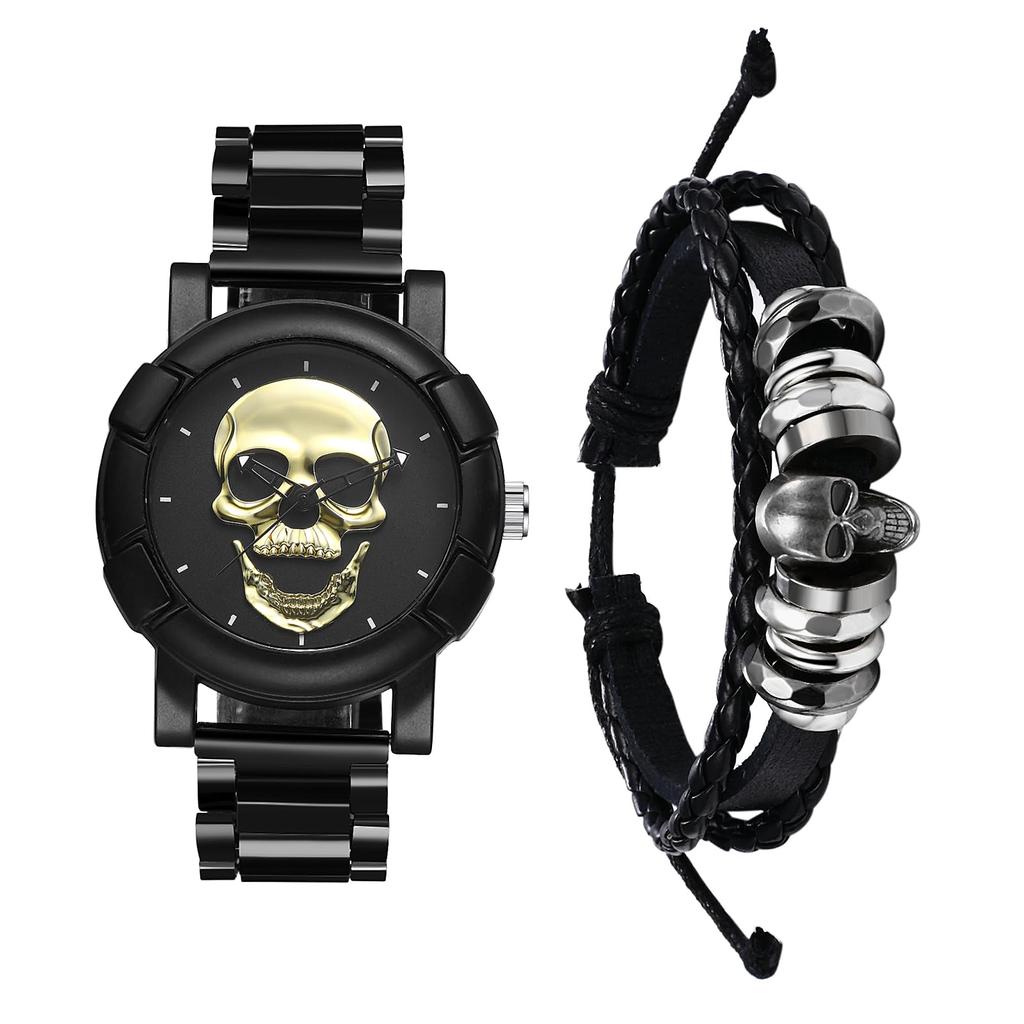 Skeleton Watch Bracelet Set of Rock Punk Leather Strap Stainless Steel Watch Waterproof Analog Quartz Skull Gothic Accessory Birthday Christmas Day — buy online with free worldwide shipping!
