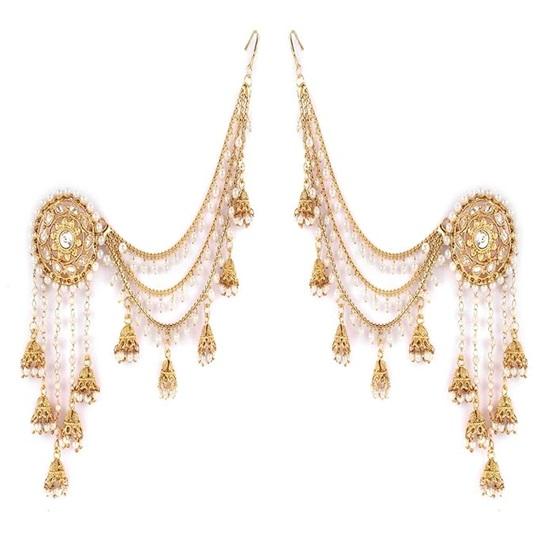 Gold Plated Pearl Jhumki Traditional Earrings with Hair Chain (Bahubali Hair Chain) are a stylish option for party wear.