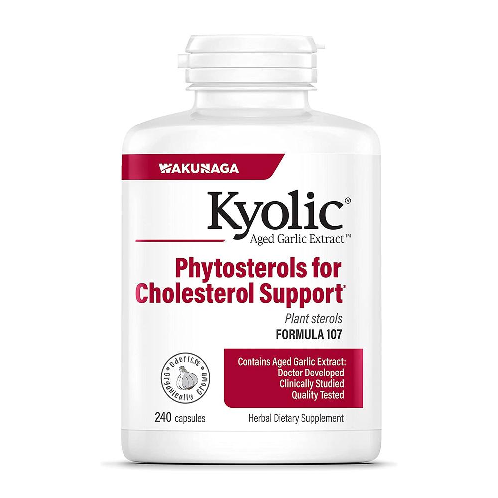 Kyolic® Aged Garlic Extract™ Formula 107 for Cholesterol contains 600 mg of AGE and 400 mg of Phytosterols (plant sterol and stanol esters) per serving. Phytosterols are plant fats that are structurally similar to cholesterol. They can inhibit the absorption of dietary cholesterol by competing for space in the intestinal tract which decreases LDL (bad) cholesterol.* This synergistic plant-based blend naturally supports healthy cholesterol levels and overall cardiovascular health.*