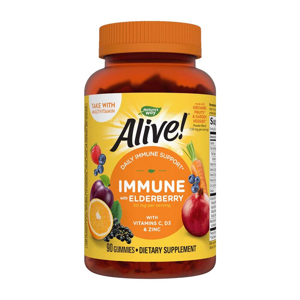 Whatever you have planned for the day, support your immune health with these delicious grape and cherry flavored gummies.* Formulated with 100% DV or more of vitamins A, C, E, and D3 plus an excellent source of zinc,* Alive! Immune Gummies can be taken alongside your favorite daily Alive! multivitamin. They also contain elderberry extract for traditional immune support.*