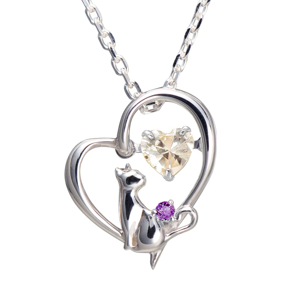 Necklace Heart Cat Dancing Stone Silver Selectable Birthstone Gold February Amethyst [Future Angel] Women's [Champagne Color]