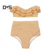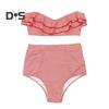 The high-waisted bikini bottom offers a flattering fit, while the pleated double ruffle crop top adds a chic touch. Featuring an adjustable padded push-up bra and removable spaghetti straps, this set is both fashionable and functional.