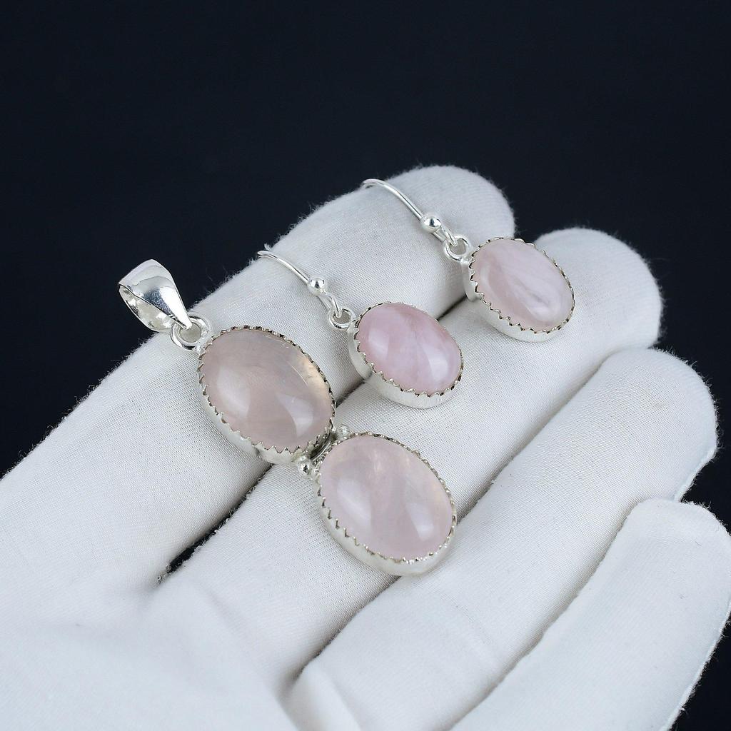 Natural Rose Quartz Pendant Set, Rose Quartz Gemstone Handmade 925 Sterling Silver Earring Pendant Set For Women Pendant Party Wear Gift — buy online with free worldwide shipping!