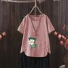New Lotus Print V-neck Cotton Hemp T-shirt for Women - 2025 Summer European & American Style