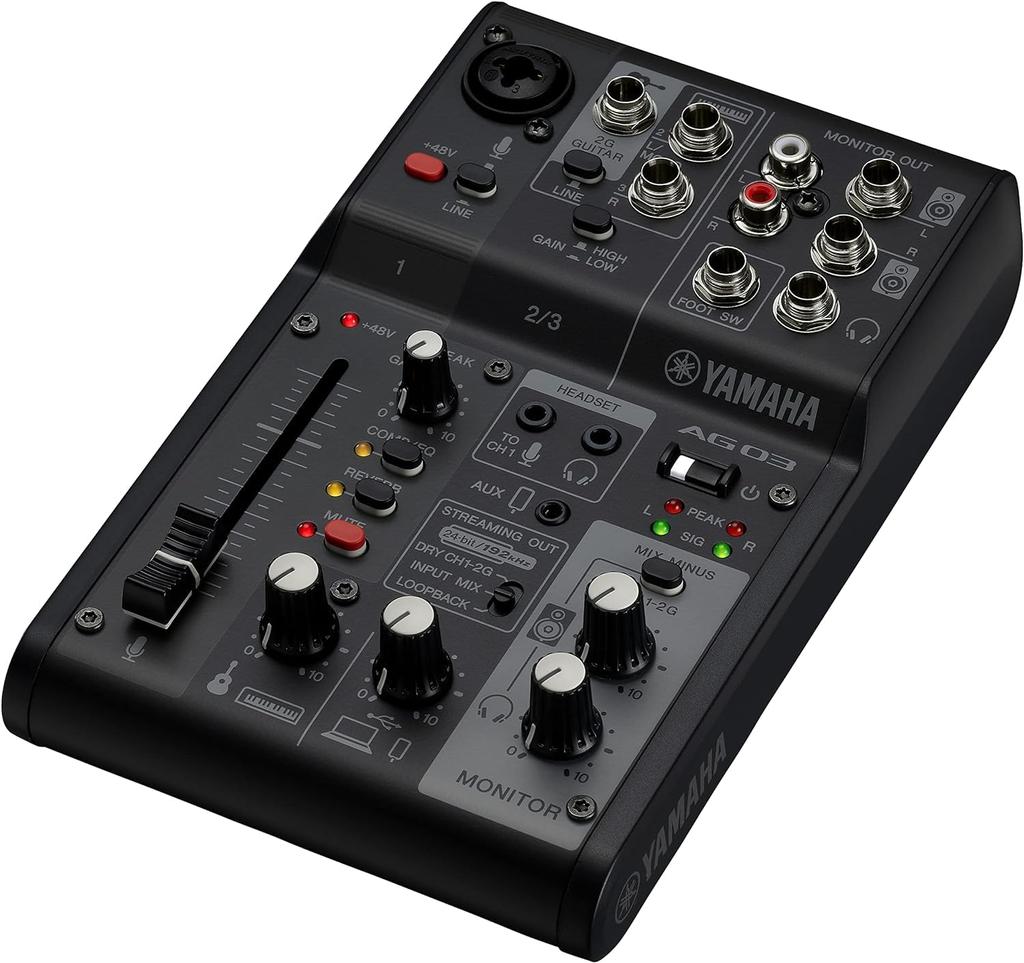 [Achieve high-quality live streaming] Yamaha's AG03MK2 B is a 3-channel mixer that provides clear and professional sound quality. This allows you to deliver a high-quality audio experience to your listeners. [Easy to operate, even for beginners] The intuitive operation panel and simple design make it easy for even beginners to use it. This reduces preparation time for broadcasts and allows you to go live right away. [Multi-functional and flexible settings] AG03MK2 B supports a variety of inputs such as microphones, musical instruments, and PC sound sources. This enables live streaming in a variety of situations, expanding the range of creative expression. [Compact and convenient to carry] Lightweight and compact design makes it easy to carry. This allows you to easily perform live streaming anywhere, and expand the range of your activities regardless of location. [Durability and Reliability] Yamaha's high-quality product design provides stable performance over long periods of time. This allows you to use it for a long time with peace of mind, and it is also cost-effective.