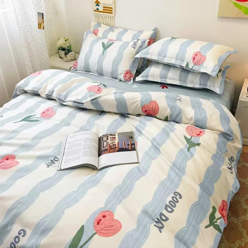Striped Flower Duvet Cover Set + Flat Sheet + 2pc Pillowcases Single Double Twin Queen King Size Bed Linen Bedding Textile B90F