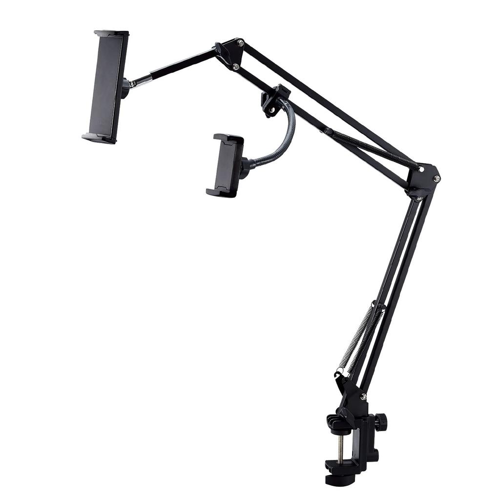 A flexible arm stand that allows you to install one smartphone or tablet at a time.