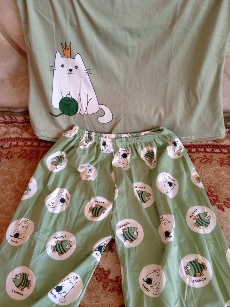 It fits just right on bust 112, hips 118, it's comfortable to sleep in, the pajamas are very cute, and the t-shirt can be worn not only at home. It's sewn neatly, no threads sticking out. I recommend the purchase. It was folded and packaged in a zip bag. It arrived in three weeks. Nice. Thank you to the seller and Joom!