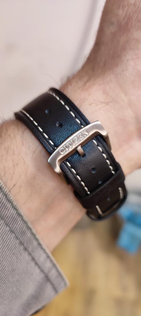 High quality 21cm long and 22mm wide black leather strap with buckle.