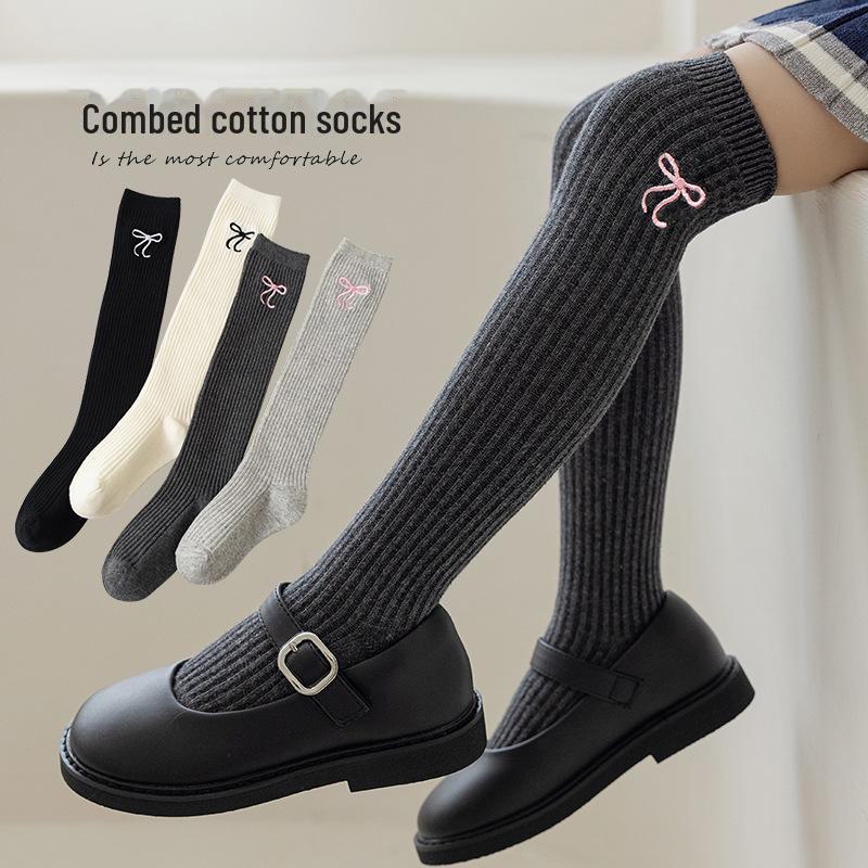 Kids' Over-the-Knee Cotton Socks with Double Needle Embroidery - JK Lolita Style for Spring, Autumn & Winter