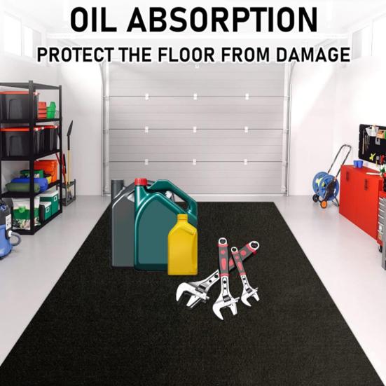 Crafted from robust, water-absorbent dense felt, this garage floor mat is tear-resistant and wear-resistant, effectively absorbing oil, water, and other liquids to maintain a dry, clean floor surface while concealing imperfections. Featuring a waterproof rubber backing, it keeps the mat securely in place and prevents fluids from seeping into the garage floor, safeguarding against damage and stains.