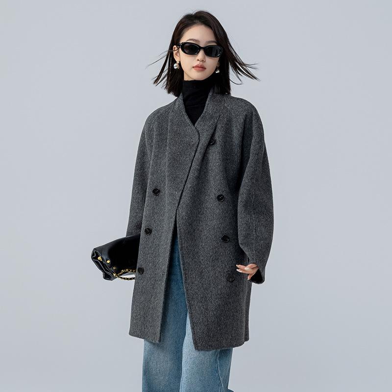 2025 Autumn/Winter Women's Stand Collar Double-Faced Medium Cocoon Alpaca Wool Coat