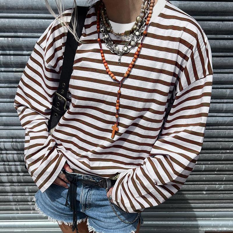 Striped T-shirt Women's Loose Round Neck Long Sleeved Top Retro Contrasting Color Basic Style Thin Commuting 2025 Spring/Summer — buy online with free worldwide shipping!