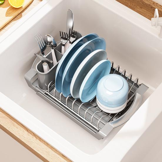 Crafted from high-quality stainless steel and plastic, this rust-proof rack boasts stability with six non-slip rubber feet for countertop protection. Cleaning is a breeze - simply remove the tray and cutlery rack for easy access to the drain. Optimize your kitchen space with this versatile and durable dish drain rack.