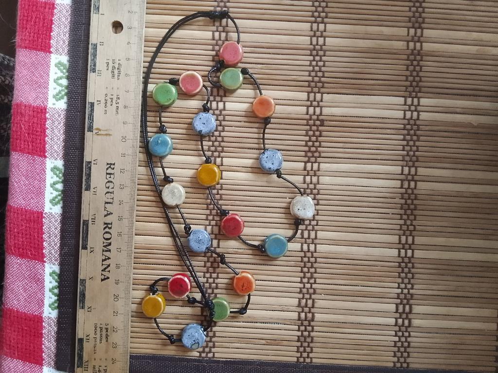 The beads are very cute. The combination of colors of the flat ceramic beads is pleasant. They are long by themselves - at the minimum length, the lower part ends under the ribs, at the solar plexus. They have an adjustable length, with two sliding knots on the upper part, i.e., they can be made longer. They are made very neatly.