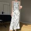 Silk Acetate Satin One-line Neck Halter Dress Split Slim Floral Long Dress Spring Summer