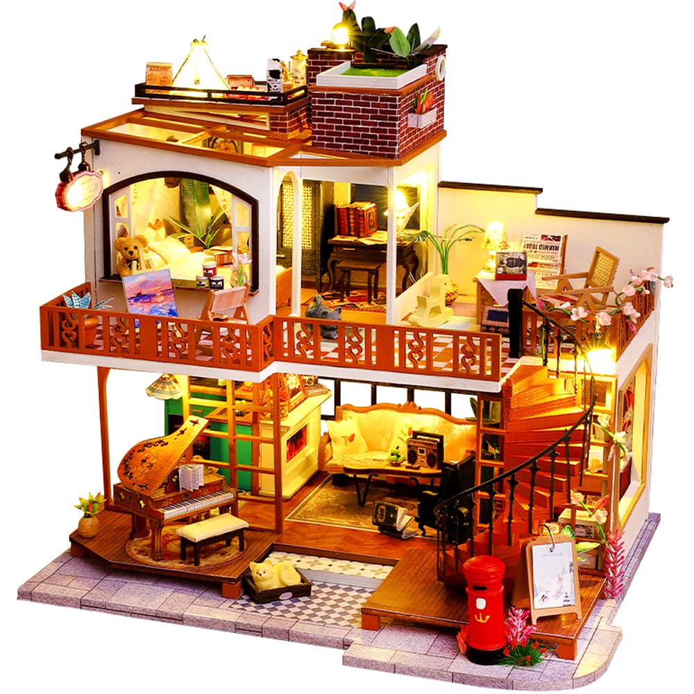 This is a 1/24 scale miniature dollhouse handmade kit. The gentle light creates a warm atmosphere, and the two-story design is attractive with careful attention to detail. There are stairs, terraces, and accessories, making it a product filled with the joy of handmade crafts and the joy of decorating.