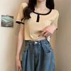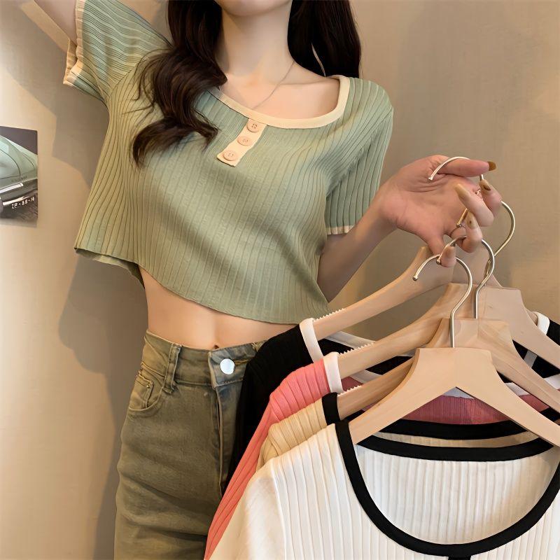 Square Neck Color Blocked Short Sleeved T-shirt for Women In Summer French Style Spicy Girl Knitted Base Shirt Front Shoulder Top — buy online with free worldwide shipping!