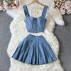 Women's Chic Hong Kong Style Retro Suit Short Camisole Vest Mini Denim Skirt Suit