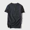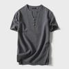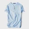 Men's Solid Color V-Neck Cotton Linen Short Sleeve T-Shirt with Buttons