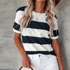 Blue White Stripe Patchwork Women's Tees Top Summer Short Sleeve Round Neck Slim Pullover Tops Fashion Vintage Female Clothing — buy online with free worldwide shipping!