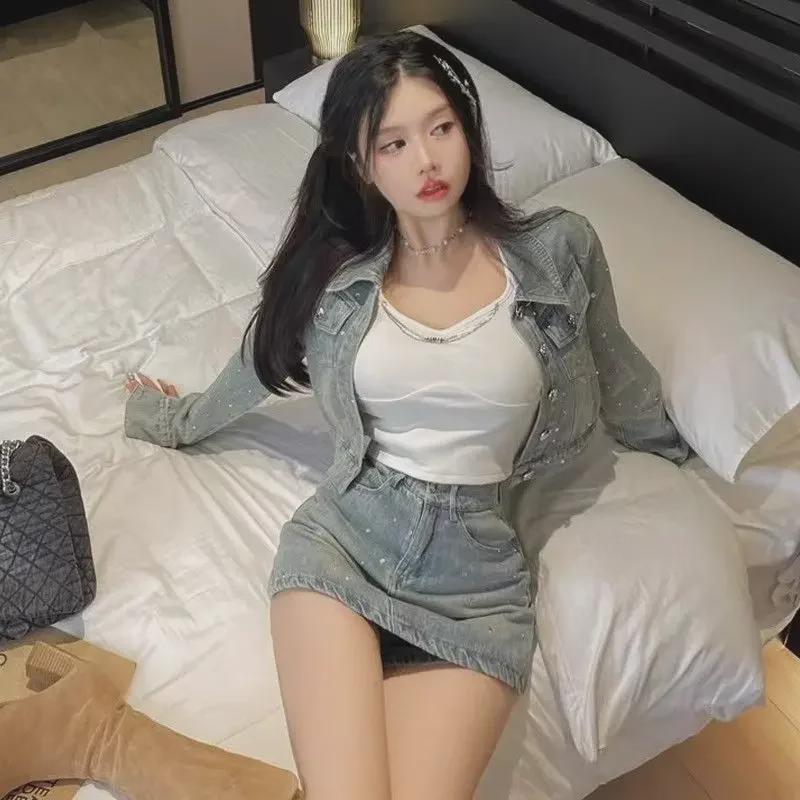 Women's Heavy-Duty Hot Diamond Denim Suit - Korean Style, Spring/Autumn 2024: Short Jacket + Skirt Pants Two-Piece Set — buy online with free worldwide shipping!