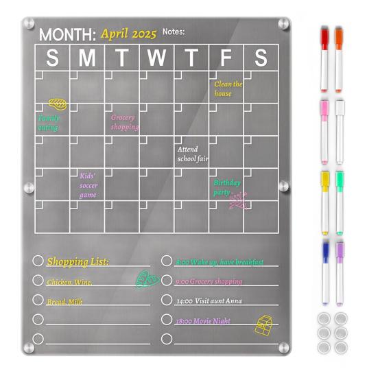This versatile magnetic calendar features eight vibrant markers for color coding and personalization. Ideal for work, study, or home tasks, the eye-catching colors ensure your notes are always visible. Perfect for organizing work tasks, managing family schedules, or teaching responsibility.