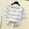 Women's Summer Thin Ice Silk Short-sleeved T-shirt Striped Square Neck Slim Thin Blouse