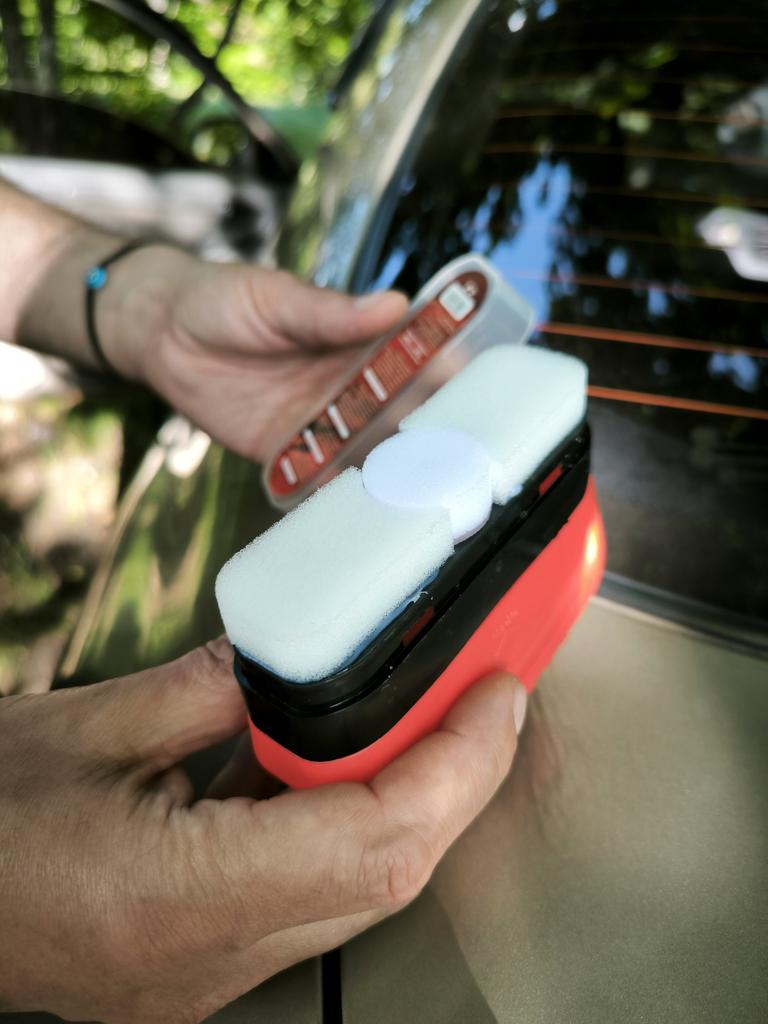 It's the second one I buy 💪 It's a marvel 🥰 The red one is the tank, it comes full with a liquid inside 👐 Then you have round sponges in the middle that provide the liquid and side sponges for cleaning 👌 The truth is that its effectiveness is wonderful, instantaneous. Durable 💪 It's barely used, it's super cost-effective and economical. I use it for all the windows in my house since it keeps them clean for months, no raindrops are left behind. I love it 🥰 100% recommendable Correct packaging 📦 Fast shipping ✈️